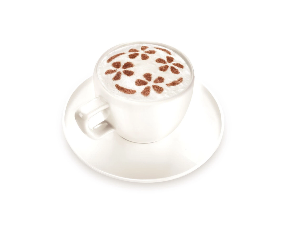 Coloque o motivo decorativo na chávena e segure-o em cima da espuma e polvilhe suavemente com canela ou cacau. Serve também para decorar o leite-creme.