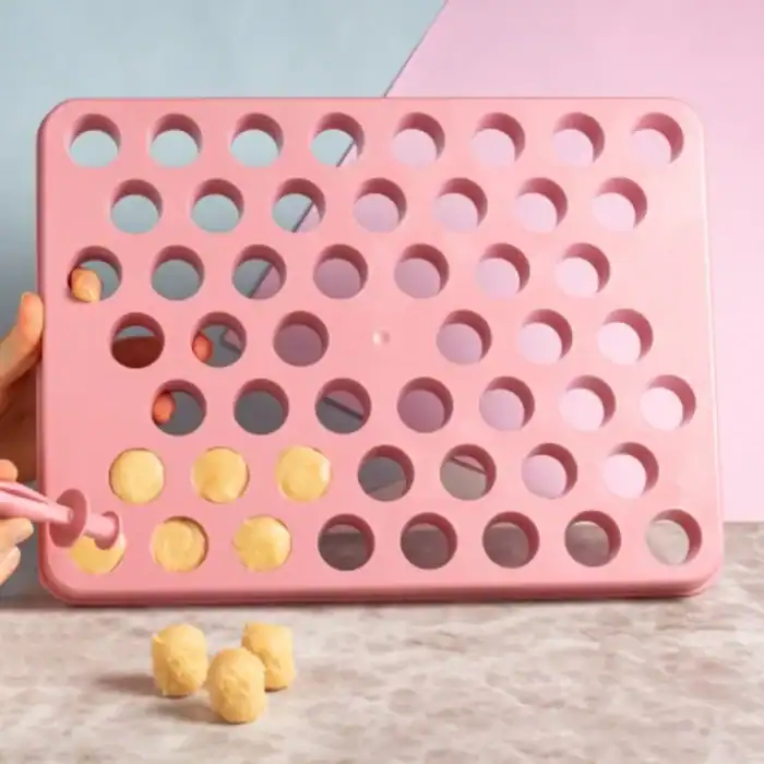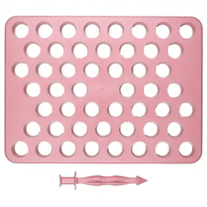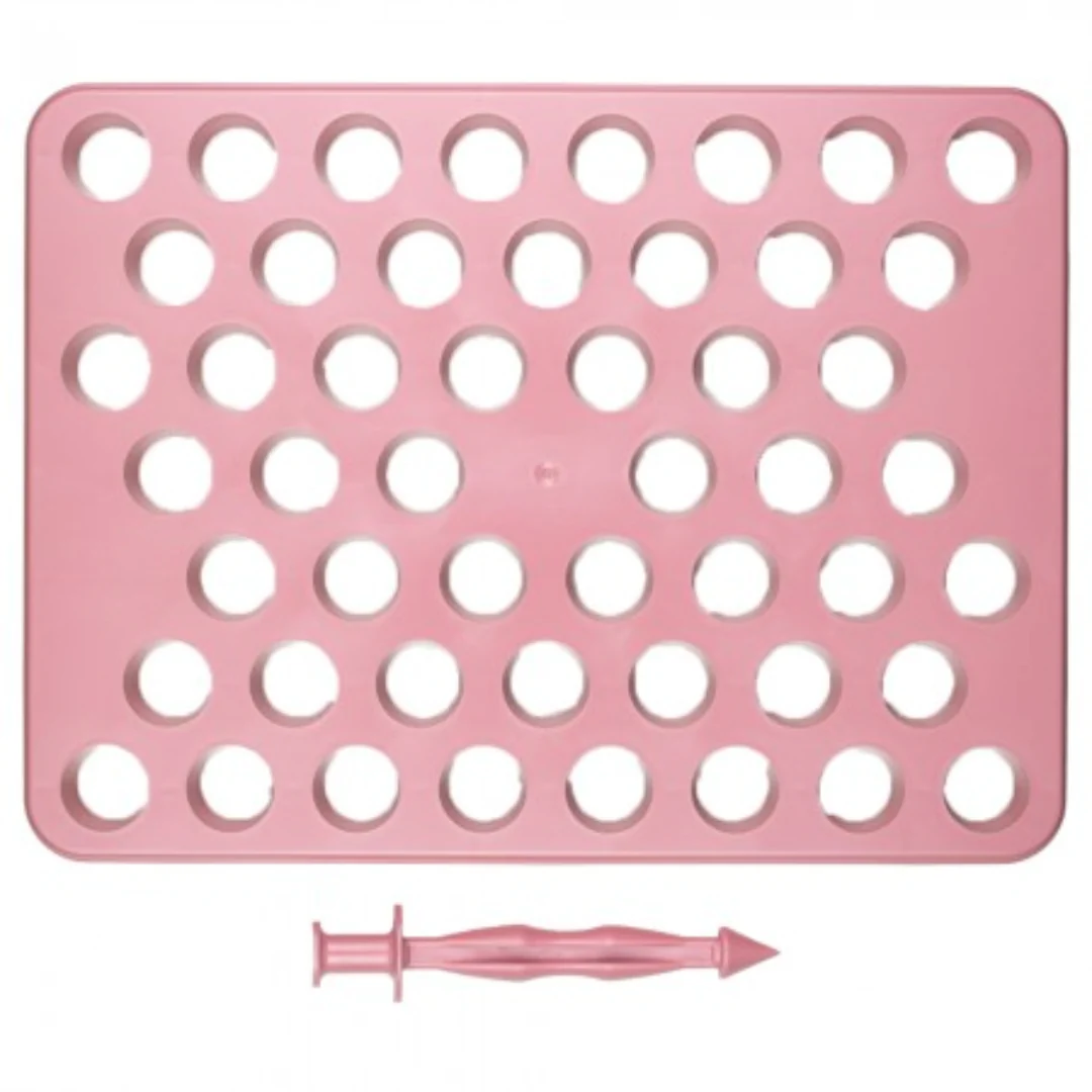 Placa Porcionadora  com um empurrador 2 em 1, onde uma ponta empurra os doces e a outra possui uma Esteca para perfurar os brigadeiros e recheá-los.