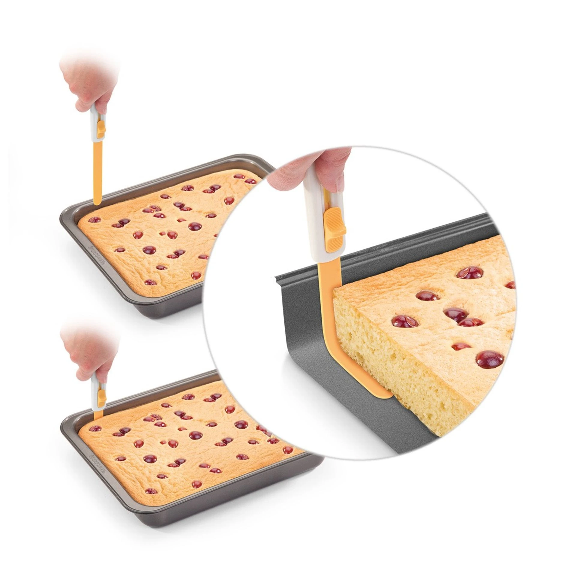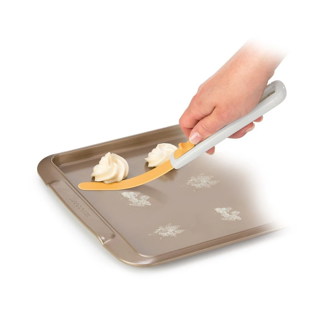 Ideal para fácil e rapidamente desenformar um bolo que esteja agarrado a uma forma de bordo alto. A lâmina flexível separa cuidadosamente o bolo do fundo e das paredes da forma alta. Excelente também para soltar dos tabuleiros os biscoitos e bolachas, merengues, etc.